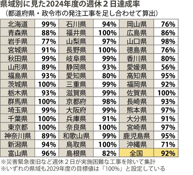 国・都道府県・政令市工事、29年度まで週休2日完全達成/第3次全国統一指標運用