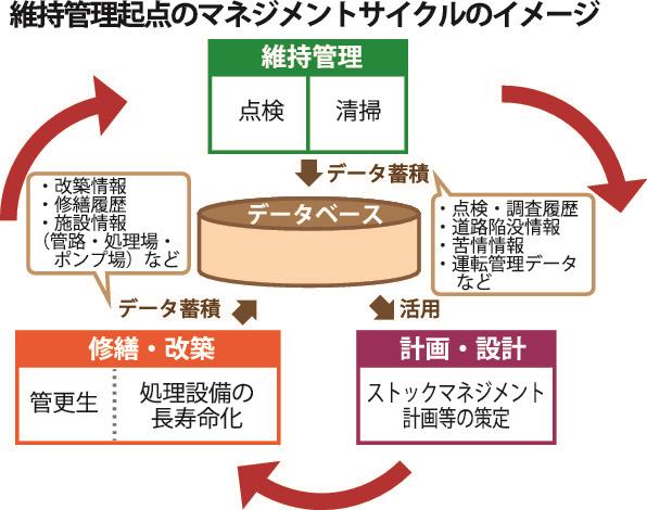 下水道管路のストックは約47万キロに達する。施設の老朽化や人口減少によって管理体制の脆弱(ぜいじゃく)化などが指摘されている。国交省は施設情報のDBを基に点検や調査、修繕、改築などのマネジメントサイクルを効率的に回し、優先的に修繕・改築する箇所の選定に役立てもらうなど、維持管理の効率化を自治体に促したい考えだ。