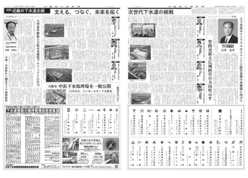 1月、埼玉県八潮市で下水道管路の破損による大規模な道路陥没事故が発生し、県内12市町に使用自粛が求められるなど大きな被害が生じた。各地でも管路事故や作業中の死亡事故が相次ぎ、上下水道のもろい面が改めて浮き彫りとなった。本特集号では、国土交通省官房上下水道審議官・石井宏幸氏の寄稿や日本下水道事業団(JS)近畿総合事務所長・岩崎宏和氏のインタビュー、さらに近畿2府5県の取り組みを通じて、強靱で持続可能な上下水道システムの実現に向けた歩みを描く。