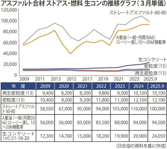 積算資料に基づく日合協の集計によると、アスファルト合材(3月ベース)の価格は、09年に1トン当たり9400円だった再生密粒度は9月で1万0100円、1万0400円だった密粒度は1万2100円となった。09年以降は中東情勢の推移やコロナ禍の影響で上下したものの、ストアス、A重油の価格は20年以降から上昇が続いてきた。合材価格も一定の改善はあったものの、価格が09年の約2倍になった生コンクリートと比較するなら、工場関係者の多くが「合材の価格転嫁は不十分」と見ている。