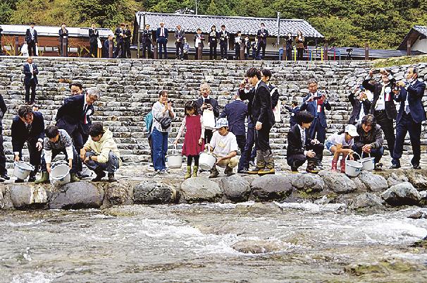 式典では来賓による祝辞に続き、事業報告などを実施。その後、塩川床固め工群で植樹式、魚の放流も行われた。
