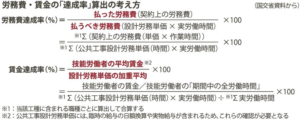 各データを発注者で処理し、労務費と賃金のそれぞれで「達成率」を算出する流れとなる。労務費の達成率は、公共工事設計労務単価をベースとした時間給を支払えるだけの労務費が確保された場合を100%とみなす。施工の工夫で生産性を向上させ、実労働時間を縮減すれば達成率も上がる仕掛けだ。賃金の達成率は、技能者の平均賃金が設計労務単価相当であれば100%とする。
