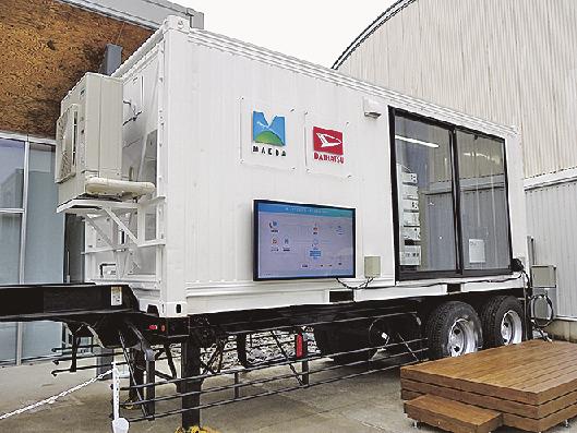 SPHと蓄電池を同じコンテナに収める。コンパクトで被災地などに運び、太陽光発電や風力発電など現地の再生可能エネルギーで電力供給が可能になる。さらにBEVを移動できる蓄電池として活用し、コンテナや複数施設間で電力を融通する。