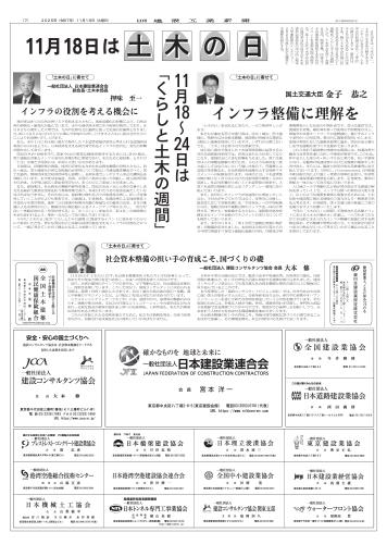 11月18日は「土木の日」。土木の2文字を分解すると十一と十八になることと、土木学会の前身である「工学会」の創立が1879(明治12)年11月18日であることに由来する。続く土木学会の創立記念日である11月24日までの1週間を「くらしと土木の週間」として、土木学会本部・全国8支部、関係企業、団体は土木の重要性を周知するためのイベントを全国各地で開催する。第113代土木学会会長の池内幸司氏や同学会土木史委員会委員長の田中尚人熊本大学准教授のインタビュー、2025年度土木学会選奨土木遺産を紹介する。 (11月18日付、本紙7~9面)