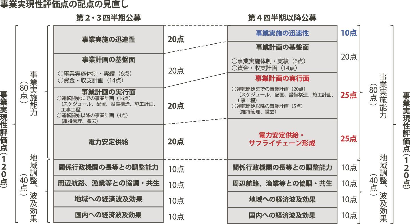 公募制度は、コスト低減を重視しながらも事業完遂が可能な計画を高く評価する。設計・調達の時間や特殊施工船の逼迫(ひっぱく)を考慮し、迅速性評価の配点を20点から10点、計画実行の配点を20点から25点に変更する。電力安定供給の評価は「電力安定供給・サプライチェーン形成」に変更し、20点だった評価点を25点にする。