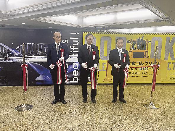 土木学会(池内幸司会長)主催の展示会「土木コレクション2025」が20日、東京・西新宿のJR新宿駅西口広場イベントコーナーで開幕した。五つのゾーンで土木プロジェクトの過去と現在を紹介し、模型や現物などで来場者に土木の魅力や奥深さを伝える。池内会長、東京都の花井徹夫建設局長、国土交通省の小島優官房審議官(技術)がテープカットを行い、イベントの開幕を祝った。会期は22日まで。
