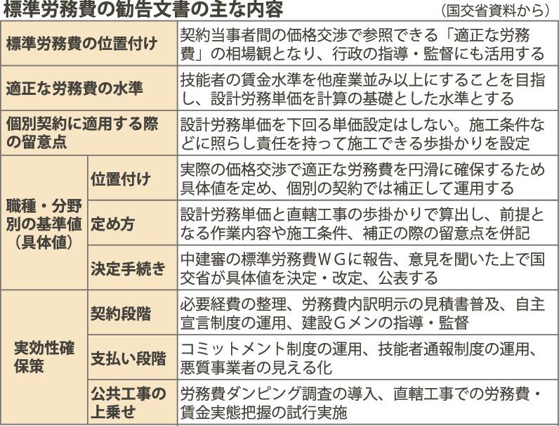 勧告文書には標準労務費の目的や設定方法、個別契約への適用方法などを明記した。鉄筋や型枠など工種別の具体的な数値は勧告対象にしない。具体値は職種・分野ごとの関係団体で調整が整った工種から順次、1トンや1平方メートルなどの「単位施工量当たりの労務費」の形で国土交通省が決定、公表する。