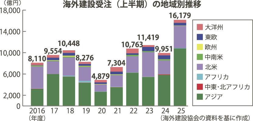 海外建設協会(海建協、佐々木正人会長)の会員企業の2025年度上半期(4~9月)海外建設受注実績(速報値)は、前年同期比62・6%増の1兆6178億8300万円だった。上半期としては過去最高を記録。22年度から1兆円規模で推移している。アジアが前年同期比85・2%増の1兆円越えとなるほか、北米も62・7%増で4000億円を超え、全体を押し上げた。