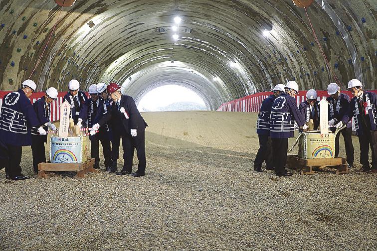 緒方所長は「大断面の掘削は難度が高く、施工者の皆さまには安全と品質を最優先に昼夜を問わず懸命な努力を重ねていただいた。今回の貫通は地域の発展と安全で安心な交通ネットワークの実現に直結する。一日も早い開通を目指し努力していく」とあいさつ。勝谷町長の祝辞に続き、樽(たる)酒を乗せたみこしが「ワッショイ」の掛け声とともに入場し、法被姿で関係者が鏡開きとくす玉開披を行った。