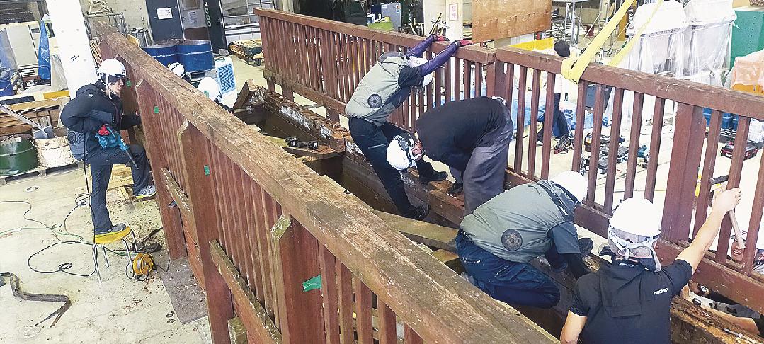 主桁は強度や耐久性が求められる用途に用いるボンゴシ材を3層重ねた構造で、リノベーションでは腐食が進んだ最上段と2段目の一部を赤松集成材に交換。さらに1段目上部にCFRPシートを接着して防水処理を施し、エポキシ樹脂と長尺木ネジで3層を一体化して強度を高めた。