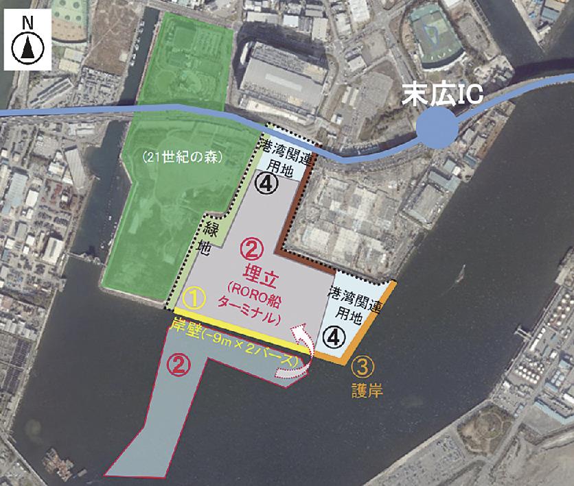 計画によると、南側に延長440メートルのマイナス9メートル岸壁(2バース)と航路・泊地(14ヘクタール)、東側に護岸をそれぞれ整備する。背後に荷さばき施設などを設ける公共ふ頭用地(約17ヘクタール)や港湾関連用地(約6ヘクタール)を創出。臨港道路「末広1号線」(2車線、約1ヘクタール)も設ける。