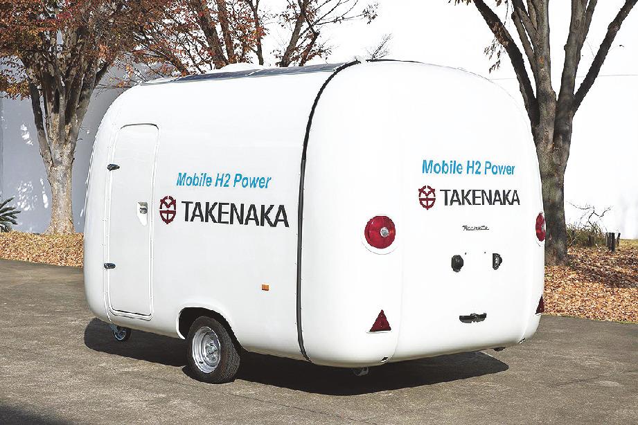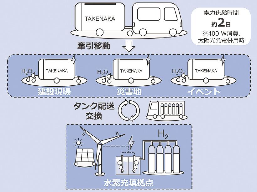 竹中工務店ら3社は、けん引式の水素発電装置を開発した。水素タンクと燃料電池を車両(被けん引車両)に搭載した移動式電源。水素を燃料に発電し二酸化炭素(CO2)排出量がほぼゼロになる。水素発電、太陽光発電、蓄電池を併用した安定的な電源システムで、設置後すぐに一般家庭2日分の電力(約20キロワット時)を供給。タンク交換で継続的に給電できる。自社の建設現場で工事用電源に活用試行するなど実証を進める。