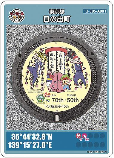 東京都日の出町が合併70周年と町制施行50周年、下水道事業着手40周年を記念し、17日からマンホールカードを配布する=写真(報道発表資料から)。国連教育科学文化機関(ユネスコ)の無形文化遺産にもなった民俗芸能「鳳凰の舞」や市のイメージキャラクター「ひのでちゃん」、記念ロゴマークで地域の魅力を伝える。