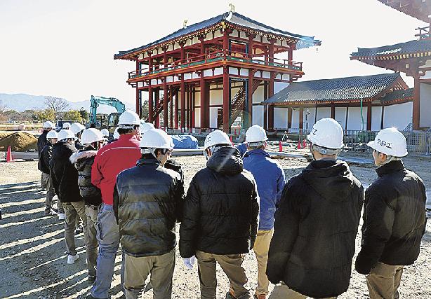 生徒たちは現場事務所で竹中工務店の担当者から現場監督の仕事の流れや復原整備工事の概要・全体工程などの説明を受けた。現場を指揮する藤原勇作業所長は「単なる建設現場ではなく、伝統建築の技術を受け継ぎ、さらに磨きをかけていく匠の誇りの現場だ。その技術を見て、触れていただき伝統建築の職場や仕事に興味を持ってもらえるとうれしい」と話した。