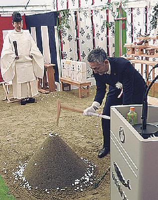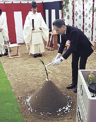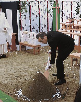 神事では大成ユーレックの水谷昇平設計部長が鎌入れ、熊谷大利府町長が鍬入れ、橋本店の武田文孝社長が鋤入れし、工事の無事完成を祈願した。