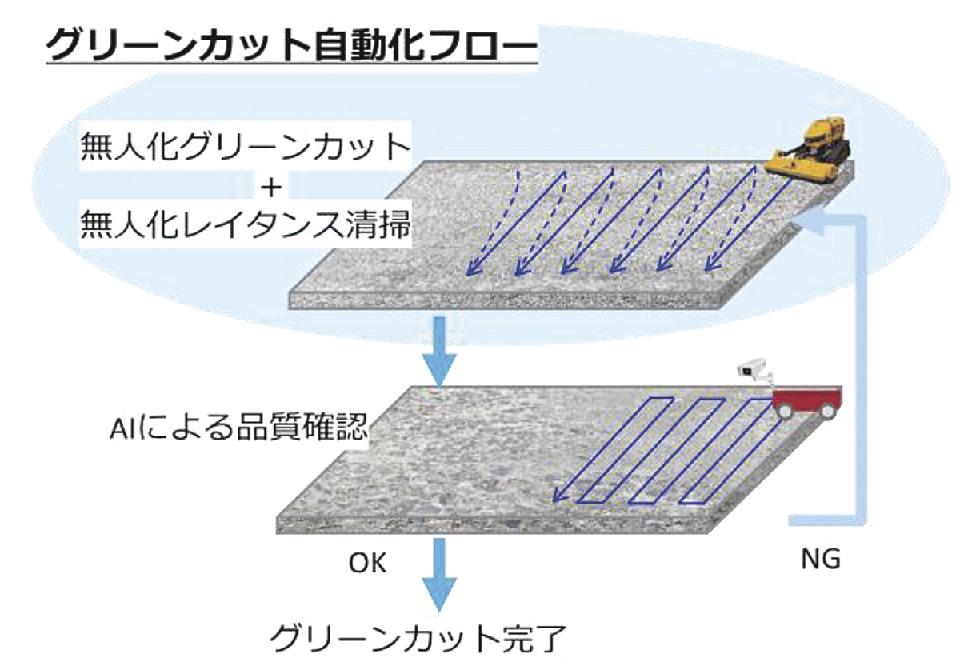 グリーンカットは、ダムコンクリ打設時にセメントや骨材の微粒子が表面に浮き上がることで作られるレイタンス層を、人力によるブラシや機械のウオータージェットなどで削り取る作業。コンクリ打設の翌日には広域な打設面を処理する必要がある。週休2日制も定着する中、現場休工日の前日にコンクリ打設ができず、休日との作業調整も課題になっていた。