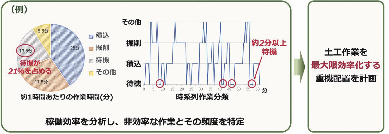 同工事の現場では、最大20台のバックホウが掘削や積み込み、敷きならし、転圧、のり面整形などの作業を行っている。AIモデルにより作業分類した定量データを基に、現場社員が非効率な作業を特定するなど、各バックホウの稼働効率を分析。この結果を活用して重機の必要台数の算出などを行った。