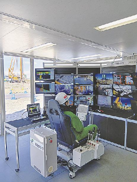 遠隔操縦システムは、施工機械の運転席の各操作レバー・ダイヤル・スイッチに後付けで機械式アクチュエーター(駆動装置)を取り付ける。施工場所付近に置いた操縦操縦室には監視モニター16台、計器モニター4台を搭載。オペレーターがモニターで現場を確認しながらレバーやスイッチを操作して制御データを送信してアクチュエーターが作動し、施工機械が動く仕組みになる。