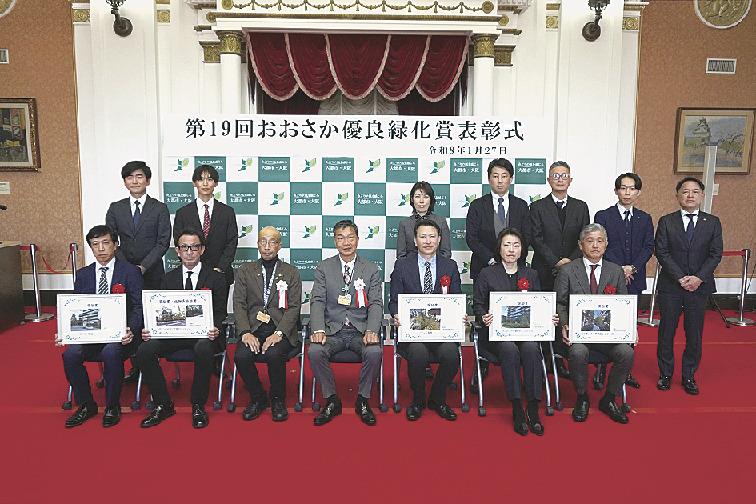 大阪府は27日、「第19回おおさか優良緑化賞」の表彰式を府庁本館(大阪市中央区)で開いた。都市環境の改善や敷地の魅力向上に寄与する優れた緑化の取り組みを行った建築主を顕彰するもので、本年度は大阪府知事賞、奨励賞、生物多様性賞の各部門で計8施設を選定。式では原田行司大阪府環境農林水産部長が受賞者に記念のパネルを手渡した。