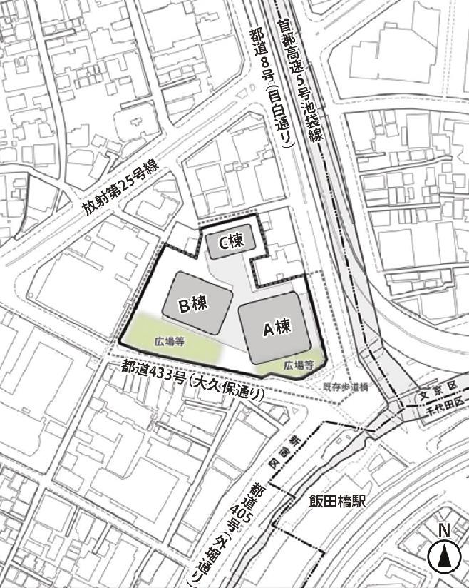 A~C棟を地下やデッキでつなぐ構造。建築基準法では1棟の建築物と見なす。再開発では飯田橋駅前の老朽化した歩道橋の架け替えにも協力する。都営大江戸線・飯田橋駅の新たな出口も検討する。改札から直結のエレベーターなども造る考え。