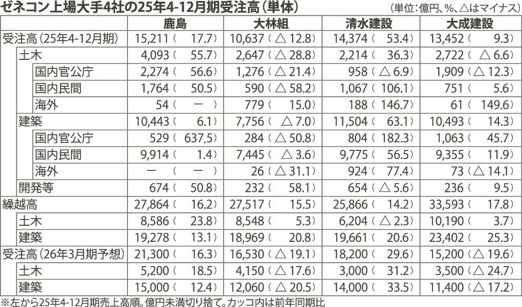 上場ゼネコン大手4社(鹿島、大林組、清水建設、大成建設)の2025年4~12月期連結決算が12日に出そろった。豊富な大型手持ち工事を順調に消化し2社が増収。受注時採算の管理を徹底して建築事業の利益率が改善し、4社が営業増益となった。26年3月期は利益率のさらなる好転を見込み、3社が業績予想を上方修正している。