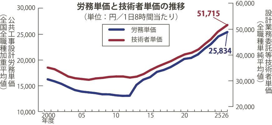 新しい設計業務委託等技術者単価は、全20職種の単純平均で前年度より4・3%上がって日額5万1715円となり、初めて5万円を突破した。2012年度単価と比較すると65・5%上昇している。