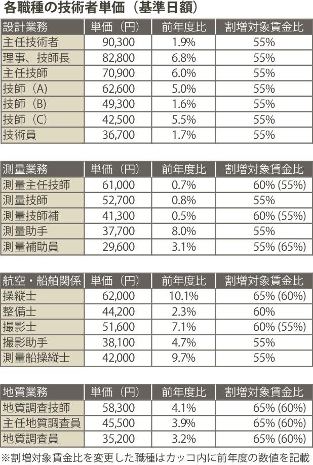 全職種で単価を引き上げた。業務別の平均は設計業務(7職種)が6万2157円(前年度比4・2%上昇、12年度比62・1%上昇)、測量業務(5職種)が4万4460円(2・2%上昇、96・0%上昇)、航空・船舶関係業務(5職種)が4万7580円(7・0%上昇、56・8%上昇)、地質調査業務(3職種)が4万6333円(3・8%上昇、69・9%上昇)。