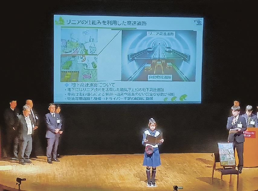 墫優佳里さん(山形県米沢市立東部小学校5年生)は「山と雪を活かした街づくり~私が目指す土木技術者の道~」と題して山の内部をかまくらのような空間として活用する街づくりを創造した。目的別に▽農業と住民の山▽住民と学校の山▽ショッピングの山▽融合の山-の四つの山を建設することを提案。内部での生活は熱交換設備を組み込み、雪と地熱を有効利用することで年間を通して快適な室温を保つ。雪解け水を農業や生活用水に活用することで山内部の生活課題を解決した。