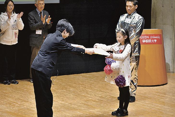 4チームには、22年度大会のコンテストで最優秀賞を受賞した川戸亮輔さんが表彰状と記念品を手渡した。川戸さんは「どの発表もとても魅力的でわくわくした。AIが提出されているチームがとても多く新鮮だった。皆さんには、中学生になっても自分の夢を発表する自信を失わずに活躍してほしい」とエールを送った。