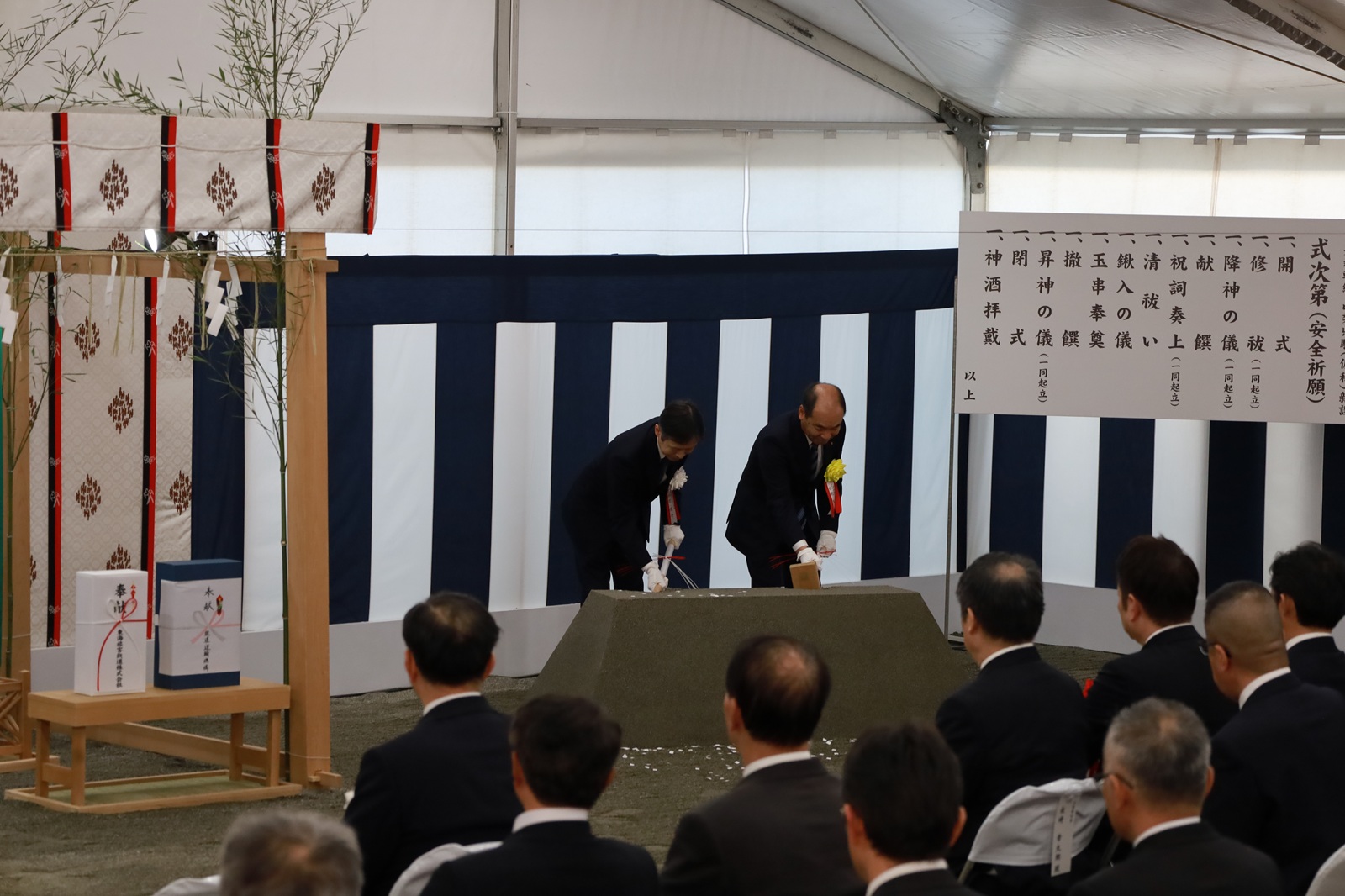 JR東海は11日、リニア中央新幹線「山梨県駅(仮称)」の起工式を、甲府市大津町の建設予定地で開いた。同社の丹羽俊介社長、施工を担当する名工建設の松野篤二社長のほか、長崎幸太郎山梨県知事ら約100人が出席。丹羽、松野両社長が盛り土に鍬を入れ工事の無事を祈願した。名工建設・鉄建建設・早野組JVが施工する。