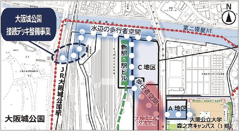 同事業は大阪城東部地区で進むまちづくりの一環。府市は20年9月に「大阪城東部地区のまちづくりの方向性」を策定し、大阪公立大学森之宮キャンパスを核に多世代・多様な人が集う国際色豊かな拠点形成を進めている。これを踏まえ、24年5月に「同地区1・5期開発の開発方針」を定め、歩行者空間のネットワーク化と世界的観光拠点形成につながるインフラとしてデッキ整備を位置付けた。