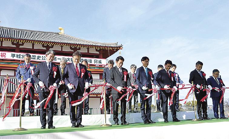 式典には奈良県の山下真知事や国会議員ら来賓を含め約150人が出席。近畿整備局の齋藤博之局長は「往時の建造物を忠実に再現するとともに、伝統技能の継承にも取り組んだ。今後も関係機関と連携し、第一次大極殿院の復元整備を進めていく」と話した。山下知事は「東楼に続き西楼などの復元が進めば、国内外からの観光客増加が期待される」と述べ、公園南側の県有地を活用したにぎわい創出にも意欲を示した。