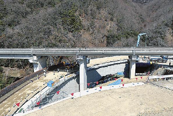 脇町IC~美馬ICの約4・8キロ区間(美馬市)では6本の橋梁を建設中。日本橋梁が上部工を施工する脇大谷川橋は橋長269・8メートルの鋼6径間連続合成2主鈑桁で、2月にすべての桁架設が完了し床版工の準備中だった。1期線に比べ15%程度鋼材を削減できたという。