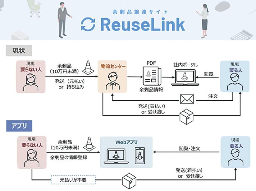清水建設は、社内で不要になった備品や資材などの再利用を推し進める。社内専用の余剰品譲渡ウェブアプリ「ReuseLink」を利用し、引き取りを希望する社員と仲介する。東京支店の試行運用では余剰品の処分費や再利用に伴うコストが抑制できた。6月に首都圏の支店、9月からは全社で本格運用する。