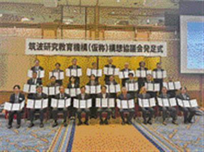 25機関の代表が同日に市内で覚書を交わし、「筑波研究教育機構(仮称)構想協議会」を立ち上げた=写真。筑波大が事務局を担う。連携大学院の枠組みをベースに、大学と研究機関の共創モデルになるような活動を進める。参加機関の独立性を保ちつつ、個別プロジェクトに横串を入れた一体感のある研究を推進。研究設備の相互利用、資金獲得のための組織的な活動などに取り組む。筑波大は約200人の教員、約500人の大学院生をそれぞれ750人、1500人に増やしたい考えだ。