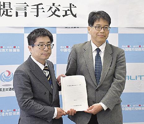 広島市中区の平和記念公園周辺の高潮対策を検討していた有識者委員会(委員長・中村良夫東京科学大学名誉教授)が提言書を取りまとめ、内田龍彦副委員長(広島大大学院教授)が26日、中国地方整備局太田川河川事務所の金銅将史所長に手渡した。河川区域だけでなく、公園との一体的整備が必要とし、早期かつ短期間での整備に努めるべきだとした。一部では浸水をある程度許容する柔軟な考えも必要とした。