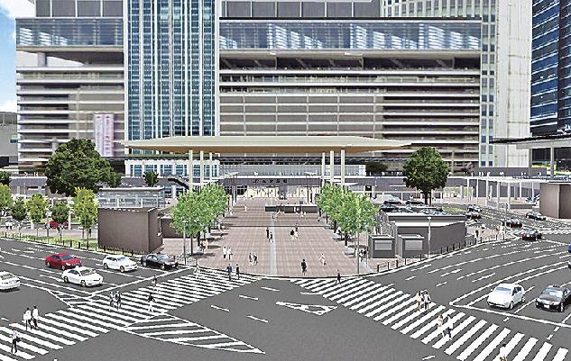 駅前広場は名古屋駅のにぎわいを西側のまちに波及させる「回遊の起点」として整備。バス・タクシー乗り場に加えて、SRT(路面公共交通システム)乗降・待合空間の設置も検討する。