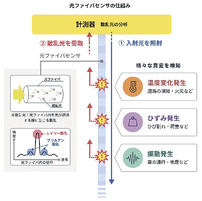 光ファイバーセンシング技術は、インフラ構造物の内部や地盤に生じるわずかな変状を遠隔から常時連続して確認できる。汎用(はんよう)の光ファイバーでひずみの大小に関係なく、延長1キロにわたりひずみの分布状態を最速150ヘルツで高速に計測。高精度で安定したひずみ計測結果を得られる。