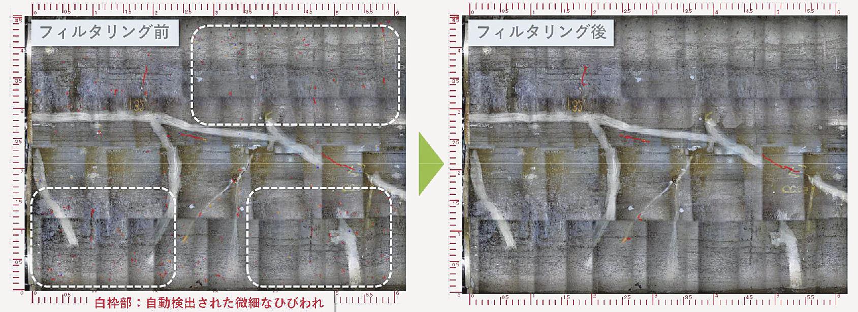 フィルタリング機能では、ユーザーが指定したひび割れの幅や長さ、方向の値に応じて対応可能とした。把握したいひび割れだけを即時に抽出し、高精度な点検データを効果的に活用できる。