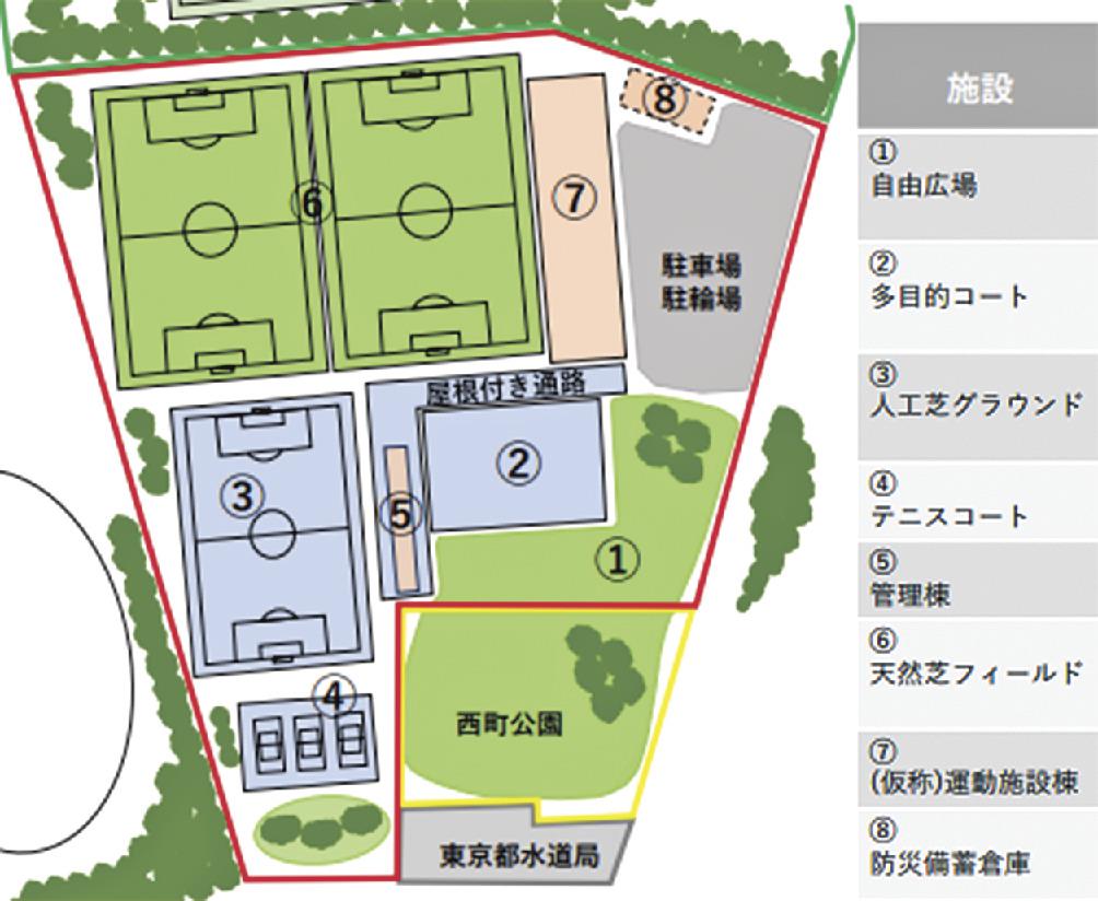 公園には、天然芝のサッカー練習場やテニスコートを整備する。災害時には帰宅困難者の受け入れも想定し、防災備蓄倉庫なども設ける。練習場などはFC東京が主体で整備し、市に寄付する。公園の指定管理はFC東京が担当。市は指定管理料を支払う。用地の確保と練習施設以外の整備も市が実施する。