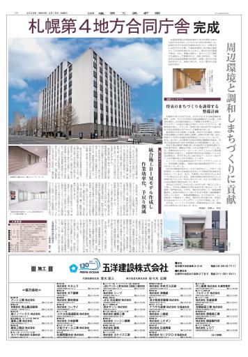 北海道開発局が建設を進めてきた札幌第4地方合同庁舎が完成し、3月23日から供用を開始した。札幌市内での合同庁舎建設は32年ぶり。札幌市内に点在する2官署、3施設を集約し防災拠点施設としての役割を果たすとともに、周辺の居住環境や歴史、文化、景観と調和し、まちづくりに貢献する施設として整備された。設計は梓設計、工事監理は北海道建築総合研究所、建築工事は五洋建設が担当した。地域に開かれ、末永く愛される施設を目指す。