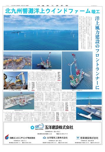 ひびきウインドエナジー株式会社が北九州市若松区沖で建設を進めていた国内最大規模の洋上風力発電所「北九州響灘洋上ウインドファーム」が竣工し、3月2日に営業運転を開始した。広さ約2700ヘクタールの海域に設置した25基の大型風車で、一般家庭約17万世帯分に当たる年間約5億キロワット時の発電を見込む。発電事業期間は20年。 工事は2023年3月に着手し、風車基礎・海洋工事を五洋・日鉄エンジニアリング特定建設工事共同企業体、O&M(運転・保守)拠点港工事を五洋・若築特定建設工事共同企業体が担当。長年培った海洋土木技術を駆使すると共に、最新鋭のSEP船(自己昇降式作業台船)などを投入し、厳しい施工環境下で効率的に高精度の施工を完遂した。