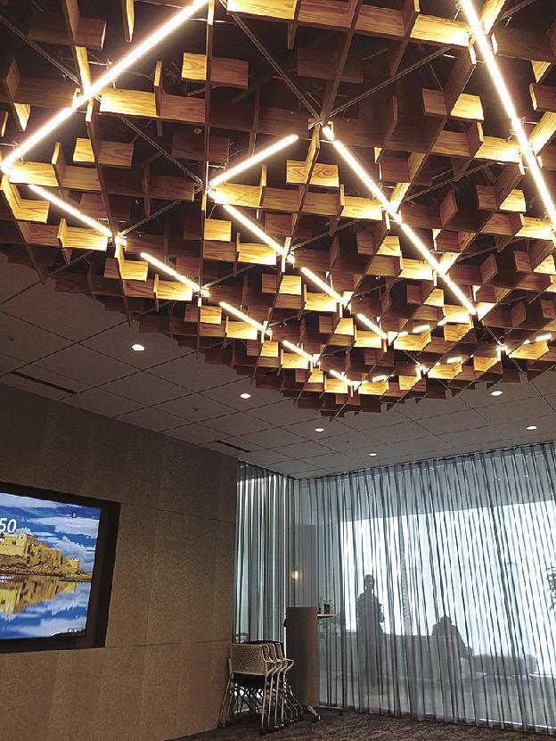 三菱地所設計ら/システム天井向け国産木材格子ルーバー開発/木質感のある意匠実現