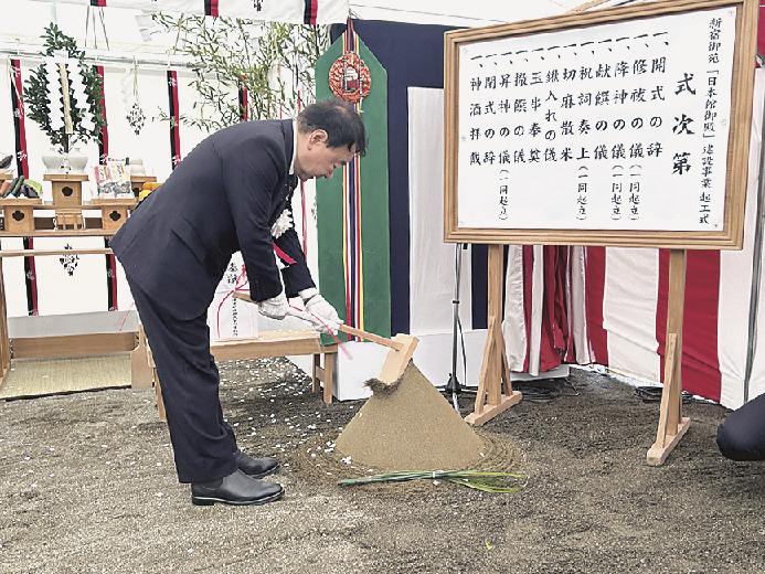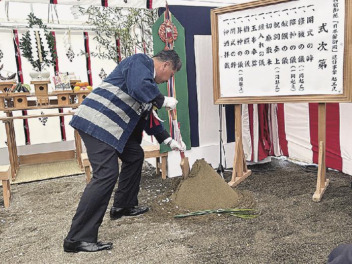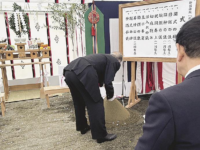 27日に起工式を開いた。環境省や工事の関係者ら約20人が出席。神事では香山建築研究所の香山壽夫会長が鎌、青山繁晴環境副大臣が鍬、佐藤秀の植木宣一郎社長が鋤を入れ、工事の安全を祈願した。