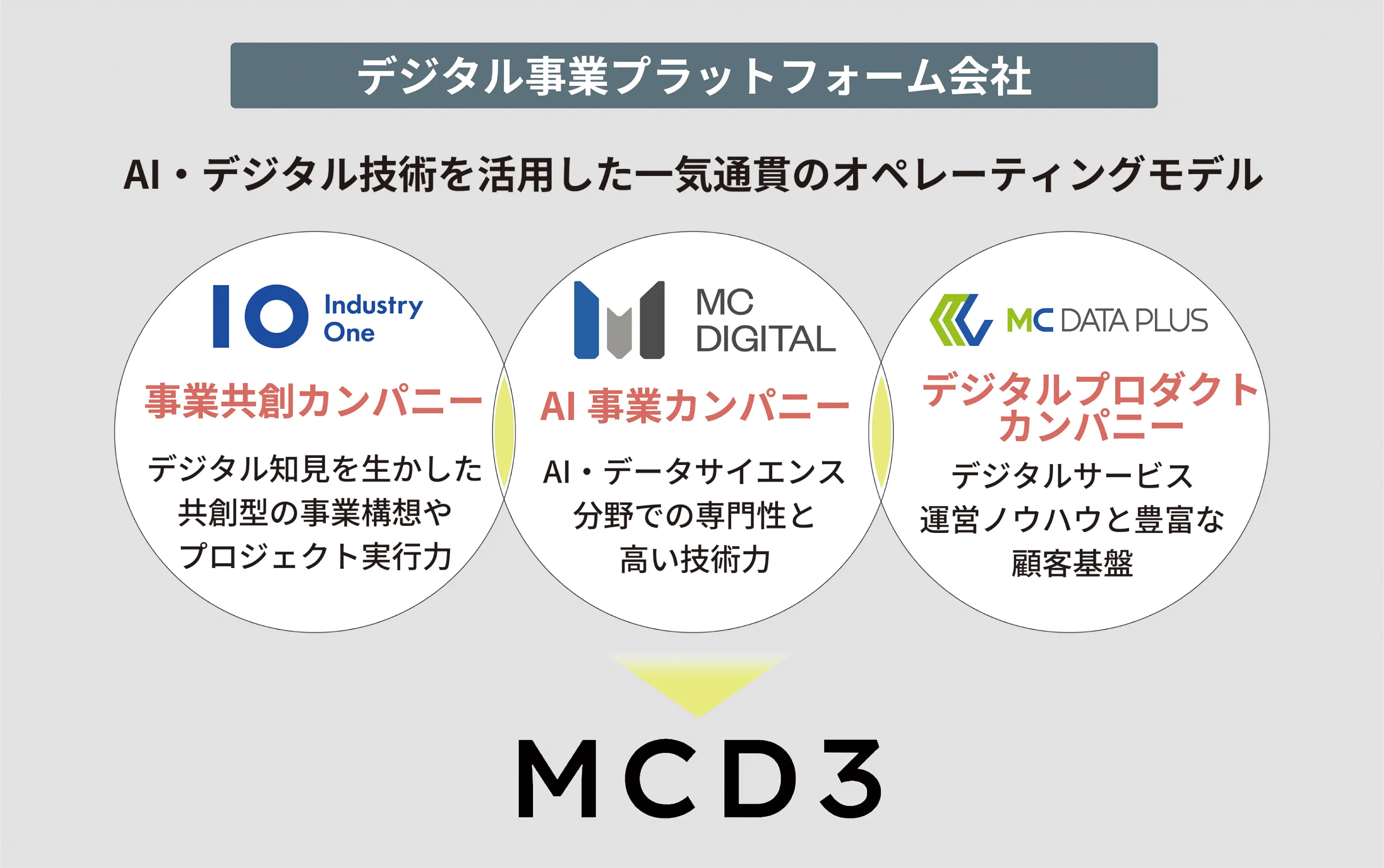 ―新会社での活動はどう展開する。 「7月1日付で合併新会社が発足して以降も、各社がそれぞれの既存領域で展開してきた事業を継続できるようにカンパニー制を導入した。具体的にはMCデータプラスをデジタルプロダクトカンパニー、インダストリー・ワンを事業共創カンパニー、エムシーデジタルをAI事業カンパニーが引き継いでいる。これまで構築してきた既存領域を縦軸としながら、各カンパニーの活動に横串を刺すことによって新しい価値を生み出していきたい」
