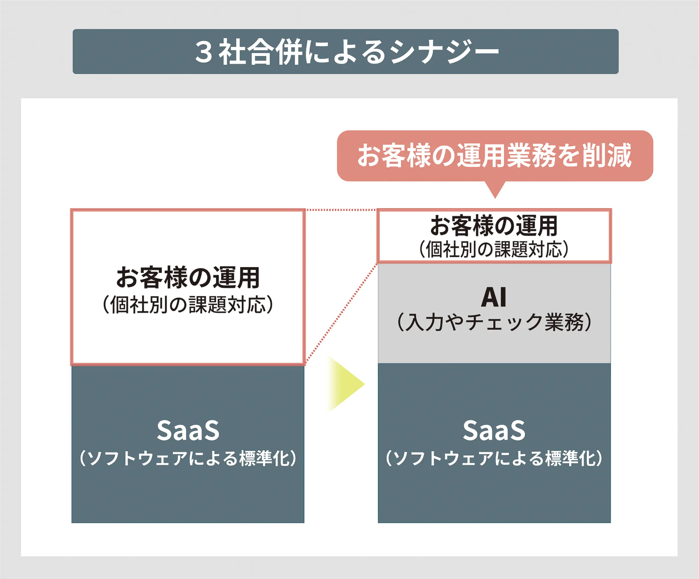 「業務を切り分けると、ソフトウエアで対応できる部分と、人の手によって運用する部分の二層に分かれる。人が運用する部分をAIで対応する部分に切り分ければ、三層に分類することができる。ソフトウエアとAIが対応する部分を増やしていけば、それだけ人による対応が少なくなり、業務負担が減る。今回の3社合併は、デジタルやAIの開発スピードが予想以上に加速している状況を見極めて決断した面もある」