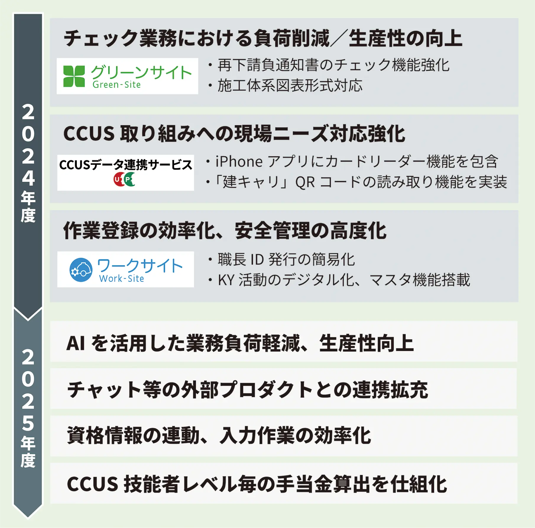建設サイト・シリーズは2024年度、次の通りにアップデートした。労務安全書類の作成・管理サービス「グリーンサイト」では、元請によるチェック業務の負担を軽減するため、再下請通知書の記載の不備や添付書類の漏れを自動検知し、協力会社が提出する前にセルフチェックする機能を強化。生産性向上の観点で国土交通省のコンパクトな施工体系図形式を追加し、印刷枚数を削減できるようにもした。協力会社の書類作成の負担軽減、操作性の改善にも取り組んだ。通門管理に建設キャリアアップシステム(CCUS)カードリーダーのiPhone対応デバイス追加など多様な現場ニーズに対応できるようにした。